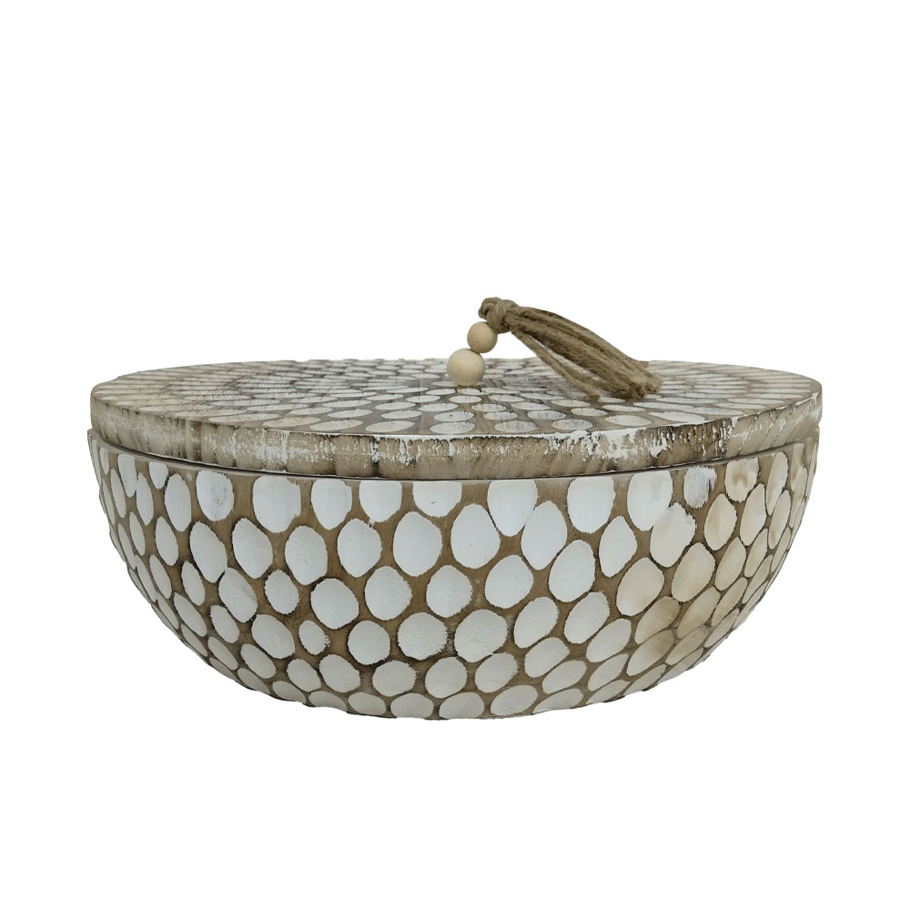 Το AMAR είναι η ιδανική ισορροπία διακόσμησης και λειτουργικής αποθήκευσης, με φυσική ξύλινη υφή και λευκό pattern που προσδίδει χειροποίητη αίσθηση. Κατάλληλο για μπάνια ξενοδοχείων, γωνιές υποδοχής ή ράφια καταστημάτων όπου απαιτείται καθαρή και οργανωμένη εικόνα. Το καπάκι διατηρεί το περιεχόμενο κρυφό, προσφέροντας τακτοποιημένο και minimal αποτέλεσμα. Ταιριάζει άψογα σε Organic Modern, Japandi και Boho Coastal concepts. Ένα υψηλής αισθητικής στοιχείο που ενισχύει το merchandising και την αίσθηση ποιότητας στο χώρο.