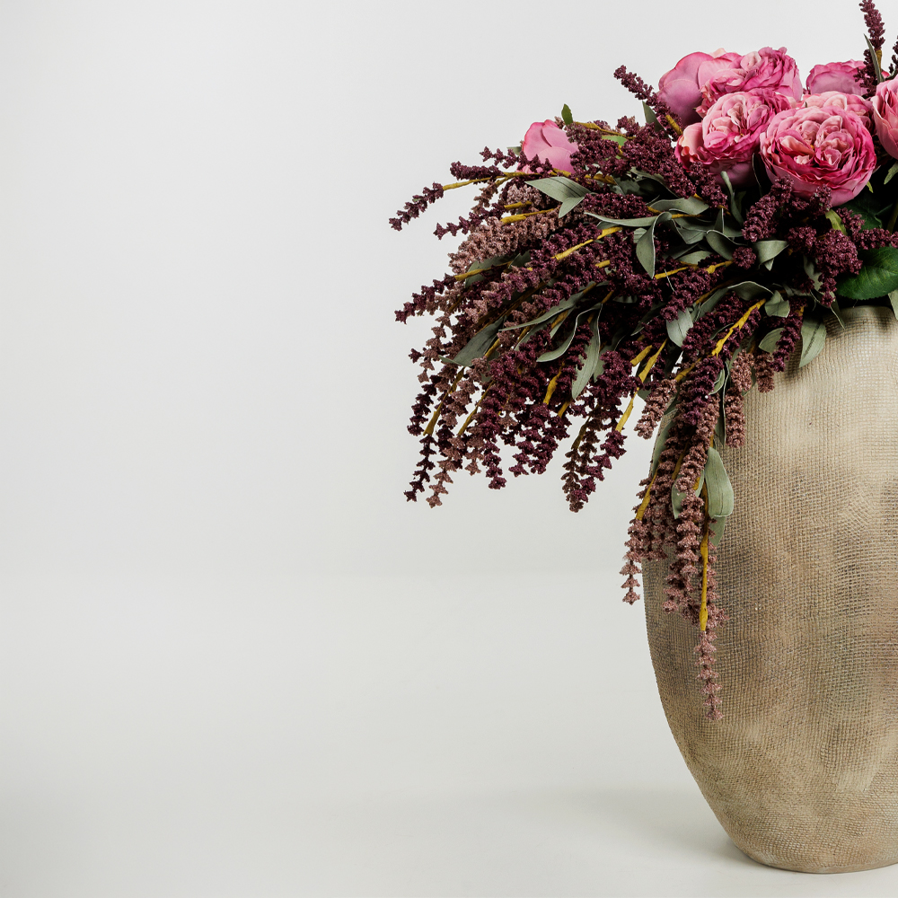 Κομψό τεχνητό λουλούδι με διακριτικό, φυσικό ύφος και λεπτεπίλεπτα άνθη σε βαθύ μωβ χρώμα. Τα πράσινα φύλλα προσθέτουν ρεαλισμό και ισορροπία στη σύνθεση. Ιδανικό για να αναδείξει floral διακοσμήσεις, στεφάνια ή βάζα με ύφος rustic ή ρομαντικό.