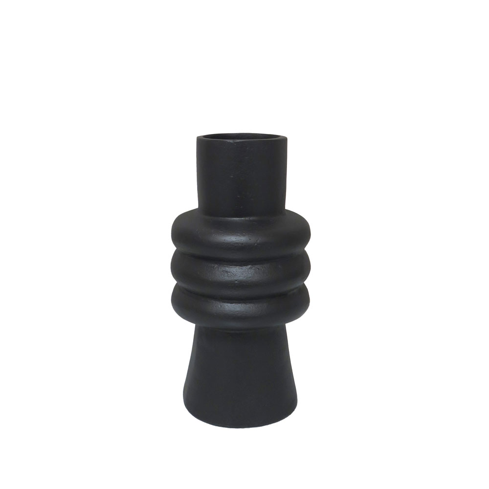 Το βάζο ARTIOM είναι ένα κομψό και μοντέρνο αντικείμενο με έντονη προσωπικότητα. Η μαύρη του απόχρωση σε συνδυασμό με το αλουμινένιο σώμα δημιουργούν μια premium υφή και sculptural παρουσία. Οι στρογγυλεμένες ραβδώσεις του σχεδίου προσδίδουν βάθος και καλλιτεχνικό χαρακτήρα. Ιδανικό για minimal διακόσμηση, loft αισθητική ή χώρους με industrial επιρροές. Μπορεί να σταθεί μόνο του ή να συνοδεύσει dried flowers για πιο ατμοσφαιρικό αποτέλεσμα.