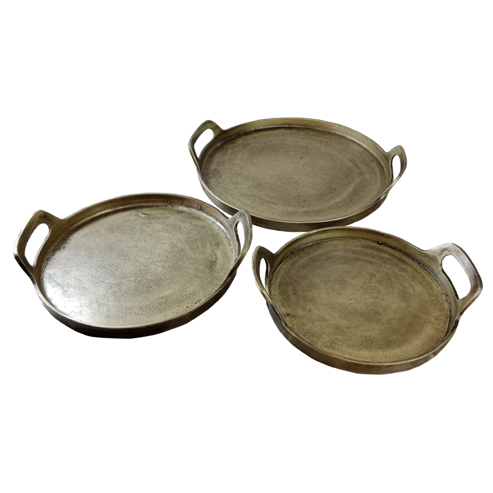Το σετ BATU περιλαμβάνει τρεις διακοσμητικούς δίσκους σε χρυσό αντικέ φινίρισμα, κατασκευασμένους από υψηλής ποιότητας αλουμίνιο. Ο ζεστός μεταλλικός τόνος και το χειροποίητο στυλ τους προσθέτουν vintage κομψότητα σε κάθε χώρο. Ιδανικοί για στολισμό σε σαλόνια, γραφεία ή boutique χώρους φιλοξενίας, προσφέροντας πρακτικότητα και αισθητική αξία.