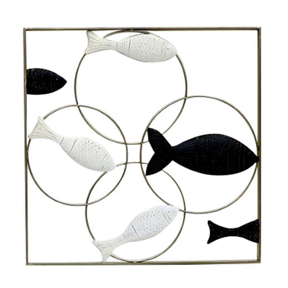 Η επιτοίχια μεταλλική διακόσμηση BRINE φέρνει στο χώρο σας μία μοντέρνα θαλασσινή αύρα. Με αφαιρετική αισθητική και χρώματα λευκού, μαύρου και χρυσού, τα ψάρια που κινούνται ανάμεσα σε μεταλλικούς κύκλους δίνουν κίνηση και χαρακτήρα στον τοίχο σας.