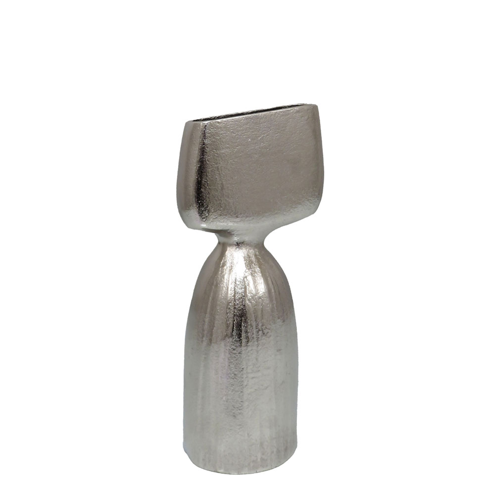 Το βάζο COBI ξεχωρίζει με την ιδιαίτερη διπλή γεωμετρία του, που συνδυάζει έναν στενό κορμό με ένα έντονο, επίπεδο άνω τμήμα. Η σύγχρονη ασημί επιφάνεια ενισχύει τον σχεδιασμό του, προσφέροντας καθαρή και μοντέρνα αισθητική. Το αλουμίνιο εγγυάται υψηλή ανθεκτικότητα, ιδανική για καθημερινή χρήση. Ταιριάζει απόλυτα σε minimal, industrial και urban chic διακοσμήσεις.