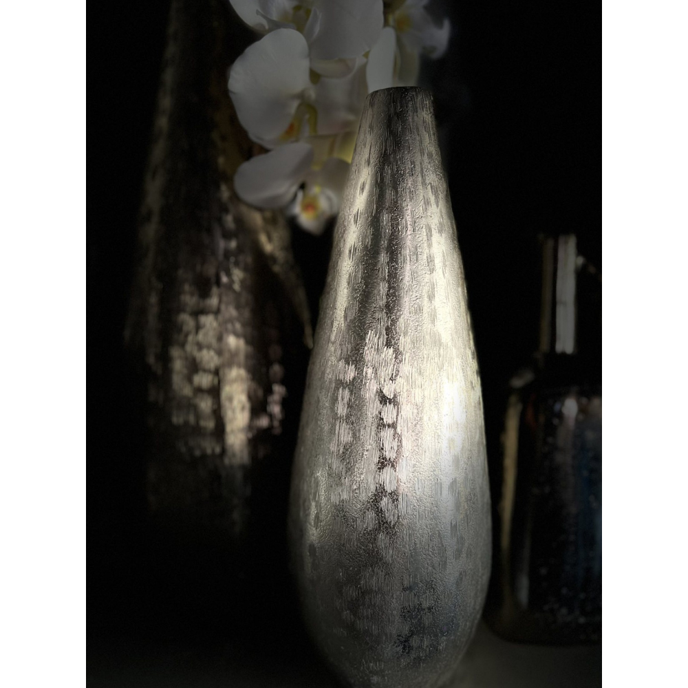 Το διακοσμητικό βάζο DROP σε ασημί χρώμα έχει εκλεπτυσμένη, επιμήκη γραμμή που προσφέρει ύψος και καθαρή σύγχρονη αισθητική. Τοποθετείται εύκολα σε ράφια, coffee tables και μικρότερες συνθέσεις. Ένα αντικείμενο που ενισχύει την αισθητική χωρίς να κυριαρχεί.