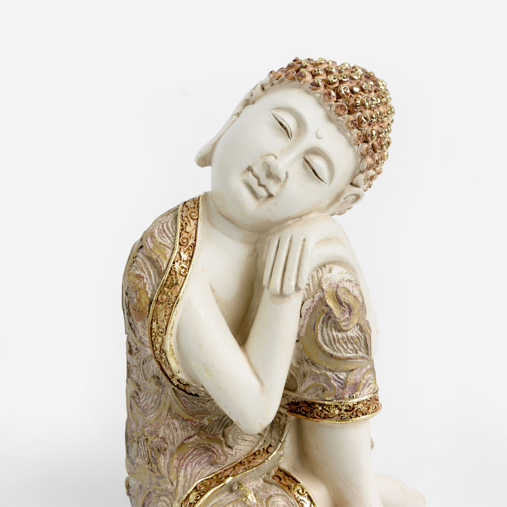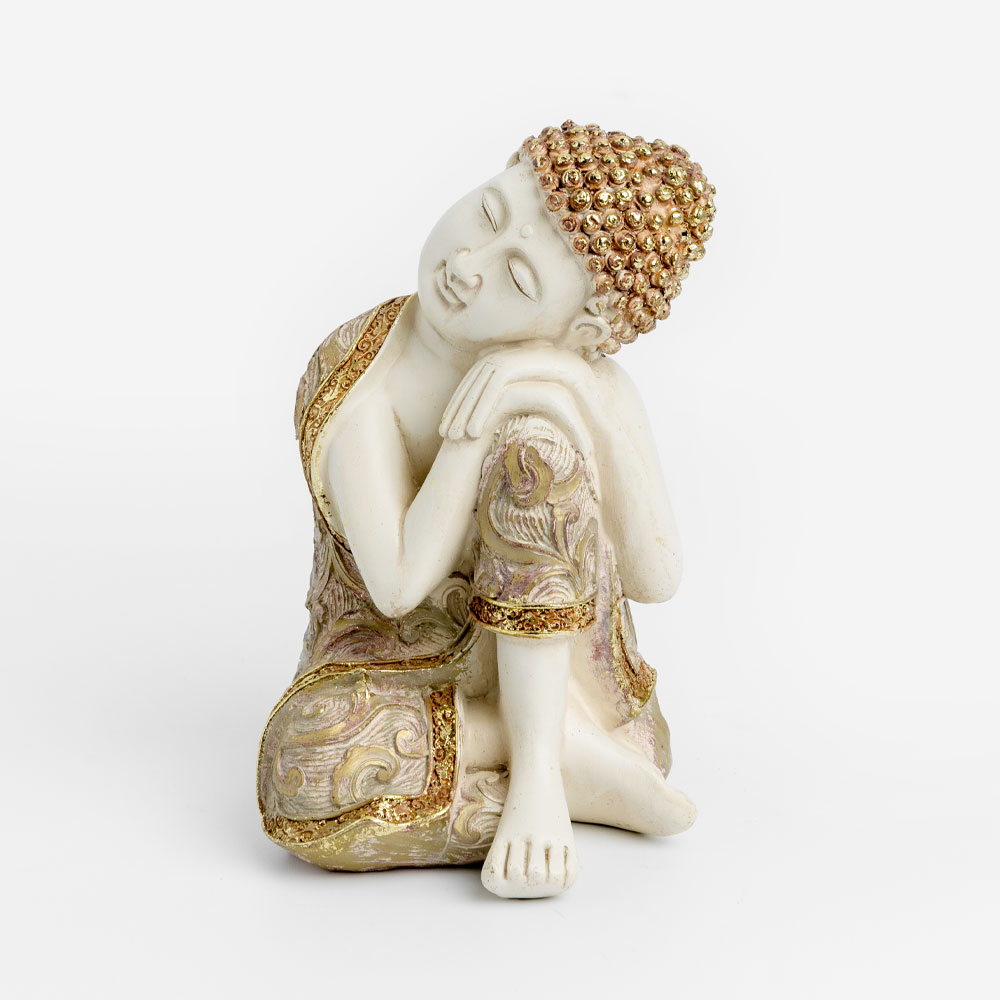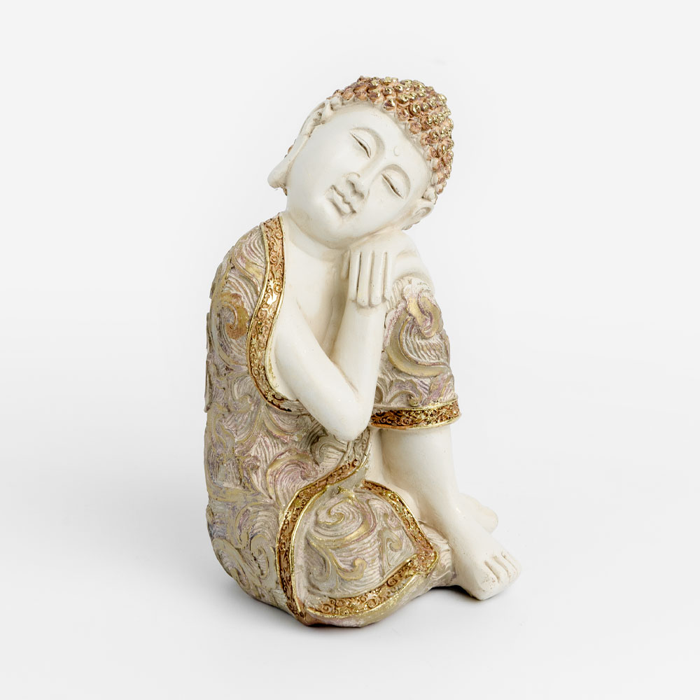 Το FADHI Resting Buddha (10x10x16cm) είναι ένα διακοσμητικό μικρών διαστάσεων που αποπνέει γαλήνη και πνευματικότητα. Με μπεζ χρώμα, χρυσές λεπτομέρειες και διακριτικούς μωβ τόνους, αποτελεί ιδανική προσθήκη για ράφια, κονσόλες ή μικρούς χώρους που αναζητούν μια νότα ηρεμίας.