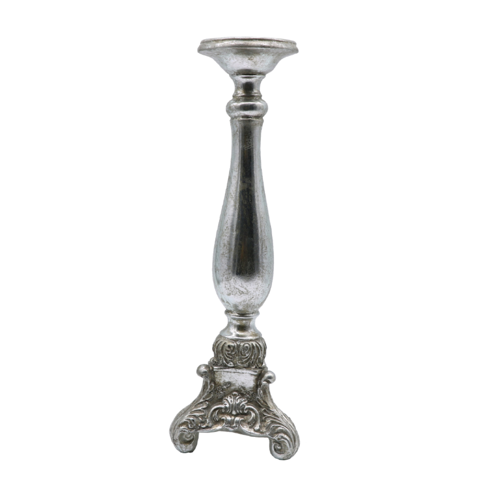 Κηροπήγιο GABI από polyresin σε ασημί απόχρωση με ανάγλυφες μπαρόκ λεπτομέρειες και διακριτικό vintage χαρακτήρα. Η εντυπωσιακή του βάση προσδίδει σταθερότητα και κομψότητα, ενώ το ύψος του το καθιστά ιδανικό για δημιουργία ατμόσφαιρας σε τραπεζαρίες, κονσόλες ή εορταστικές διακοσμήσεις.