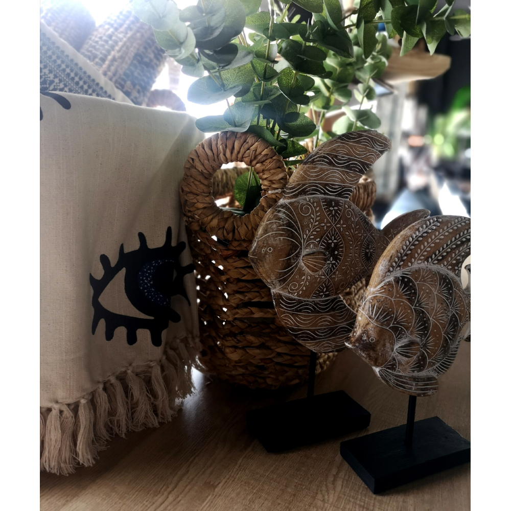 Το GOURAMI διακοσμητικό ψάρι σε καφέ απόχρωση προσφέρει μια artistic, coastal–ethnic αισθητική. Η polyresin υφή δίνει χειροποίητο χαρακτήρα και έντονη επιφάνεια. Ιδανικό για κονσόλες, βιβλιοθήκες και χώρους με φυσικά υλικά. Προσθέτει κίνηση και παιχνιδιάρικη ισορροπία στο decor. Ένα μοναδικό κομμάτι που φέρνει φυσική γοητεία.