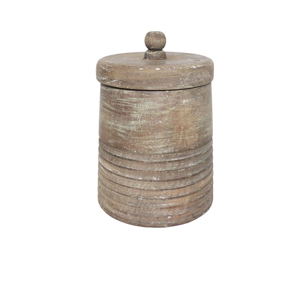 Το δοχείο αποθήκευσης INDI σε natural–antique φινίρισμα είναι ένα αυθεντικό ξύλινο δοχείο με ζεστή, οργανική αισθητική. Η χειροποίητη υφή του προσθέτει χαρακτήρα και μοναδικότητα. Είναι ιδανικό για rustic, boho ή natural διακοσμήσεις. Ένα κομμάτι που συνδυάζει λειτουργικότητα και διακριτική πολυτέλεια.