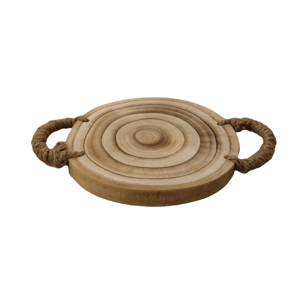 Διακοσμητικός δίσκος KENGO από ξύλο με διάμετρο 25 εκ. και λεπτομέρειες με σχοινί στα χερούλια. Ιδανικός για να αναδείξετε κεριά, βάζα ή διακοσμητικά αντικείμενα, προσθέτοντας μια φυσική και ρουστίκ πινελιά σε κάθε χώρο. Χειροποίητη εμφάνιση και ανθεκτική κατασκευή.