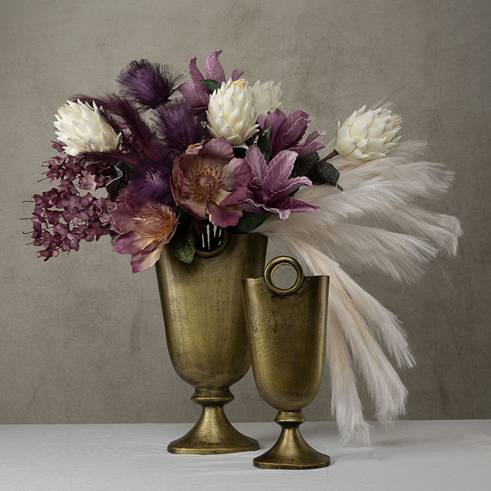 Το σετ RENGO περιλαμβάνει δύο εντυπωσιακά βάζα από αλουμίνιο σε χρυσό αντικέ απόχρωση, με ξεχωριστό design που συνδυάζει αναλογίες αρχιτεκτονικής φόρμας και artistic λεπτομέρειες. Το χαρακτηριστικό κυκλικό στοιχείο στο πάνω μέρος προσδίδει στο βάζο μοναδικό χαρακτήρα, ενώ η μεταλλική πατίνα δημιουργεί μια ζεστή, vintage λάμψη. Το σετ είναι ιδανικό για ξενοδοχειακές εισόδους, επαγγελματικά περιβάλλοντα, ράφια, dining rooms ή luxury σαλόνια, όπου λειτουργεί ως συνδυαστικό ή ανεξάρτητο decor element. Η ανθεκτικότητα του αλουμινίου το καθιστά ιδανικό για μακροχρόνια χρήση σε απαιτητικούς χώρους.