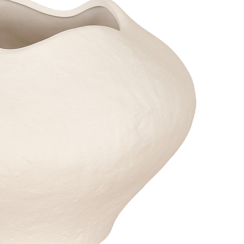 Το βάζο VERAE έχει μια απαλή, οργανική παρουσία που φέρνει φυσική ηρεμία στον χώρο. Η λευκή κεραμική του επιφάνεια με ματ υφή αναδεικνύει το ιδιαίτερο, καμπυλωτό του σχήμα, δημιουργώντας ένα αποτέλεσμα ήσυχο και καλαίσθητο. Το χαμηλό του ύψος το κάνει ιδανικό για τραπέζια, κονσόλες ή ράφια, είτε τοποθετημένο μόνο του είτε με λίγα λουλούδια. Πρόκειται για ένα διακοσμητικό αντικείμενο που λειτουργεί διακριτικά, προσθέτοντας απαλότητα και ισορροπία στη διακόσμηση.