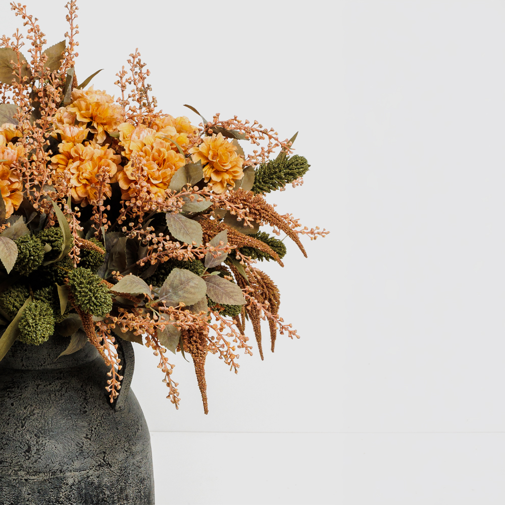 Το πορτοκαλί τεχνητό λουλούδι ZINNIA 52cm αποπνέει ζωντάνια, αισιοδοξία και δημιουργικότητα, αποτελώντας εξαιρετική επιλογή για φωτεινές και χαρούμενες διακοσμήσεις. Η φυσική υφή των φύλλων από πολυεστέρα χαρίζει ρεαλιστική εμφάνιση και κάνει το λουλούδι να ξεχωρίζει. Συνδυάζεται υπέροχα με γήινους και φυσικούς τόνους, δίνοντας ένταση και φρεσκάδα στον χώρο. Ταιριάζει ιδανικά σε χώρους που θέλουν να ξεχειλίζουν από θετική ενέργεια, τόσο στο σπίτι όσο και στο γραφείο.