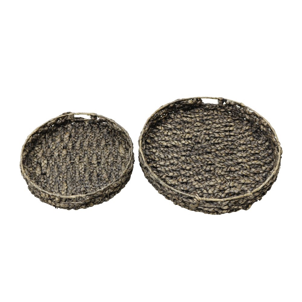 Το σετ SALV περιλαμβάνει δύο κομψούς δίσκους από φυσικό υάκινθο και μαύρο μεταλλικό πλαίσιο. Η υφή του υάκινθου προσθέτει ζεστασιά και οργανική αίσθηση, ενώ το μέταλλο δίνει μοντέρνο χαρακτήρα. Ιδανικό για boho, rustic και contemporary χώρους, αλλά και για πρακτική χρήση σε coffee tables και τραπέζια.