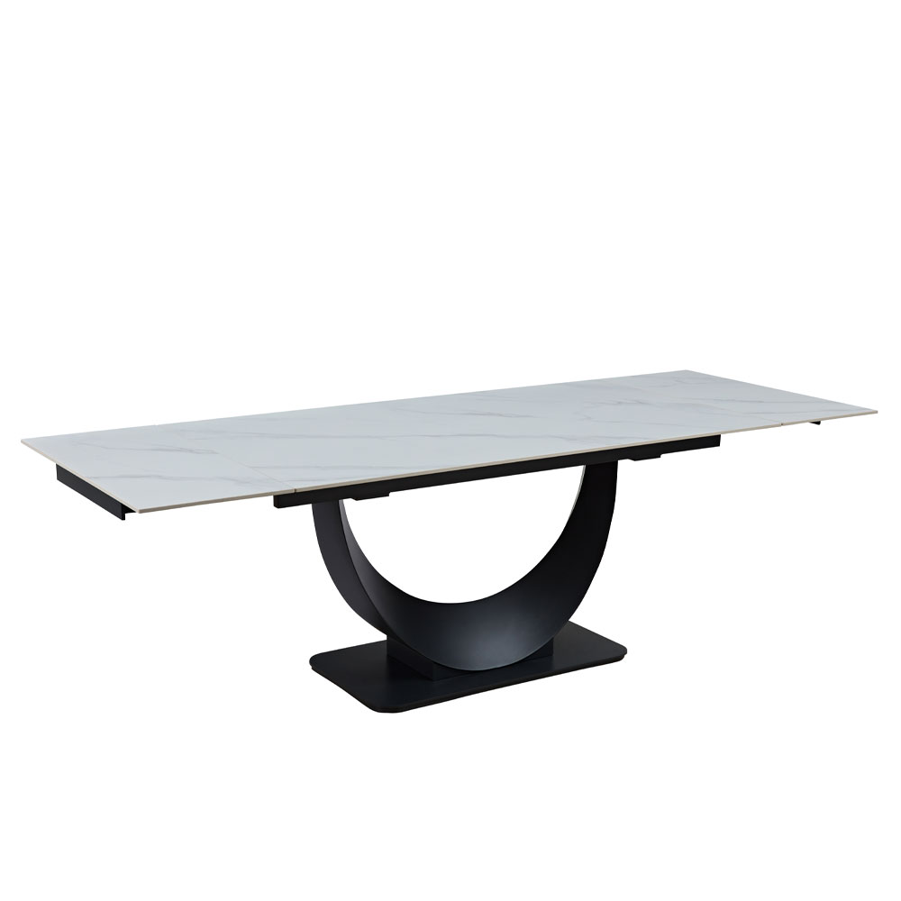 Το τραπέζι Mezza Luna εντυπωσιάζει με τον κομψό και μοντέρνο σχεδιασμό του, προσφέροντας ταυτόχρονα λειτουργικότητα και στυλ. Η επιφάνειά του είναι κατασκευασμένη που κατασκευάζεται από sintered stone, η οποία είναι θερμικά συμπιεσμένη και δημιουργεί μια στερεή, αδιάβροχη μάζα, ανθεκτική σε γρατσουνιές και λεκέδες. Αυτό το υλικό προσφέρει επίσης πρόσθετα πλεονεκτήματα, όπως δεν επηρεάζεται από τις καιρικές συνθήκες, είναι ανθεκτικό στη ζέστη και το κρύο, αδιάβροχο, ανοξείδωτο, δύσκολο να κοπεί ή να καταστραφεί, εύκολο στο καθάρισμα, ασφαλές για τα τρόφιμα, μη πορώδες, δεν απορροφά επιβλαβείς ουσίες, ενώ είναι και ελαφρύ και ανακυκλώσιμο. Η ανθρακί μεταλλική βάση, με τον μοναδικό ημικυκλικό της σχεδιασμό, προσφέρει σταθερότητα και ξεχωριστό χαρακτήρα, δημιουργώντας ένα statement κομμάτι για κάθε χώρο. Το τραπέζι Mezza Luna είναι επεκτεινόμενο, παρέχοντας τη δυνατότητα προσαρμογής στις ανάγκες σας, είτε πρόκειται για καθημερινή χρήση είτε για ειδικές περιστάσεις.