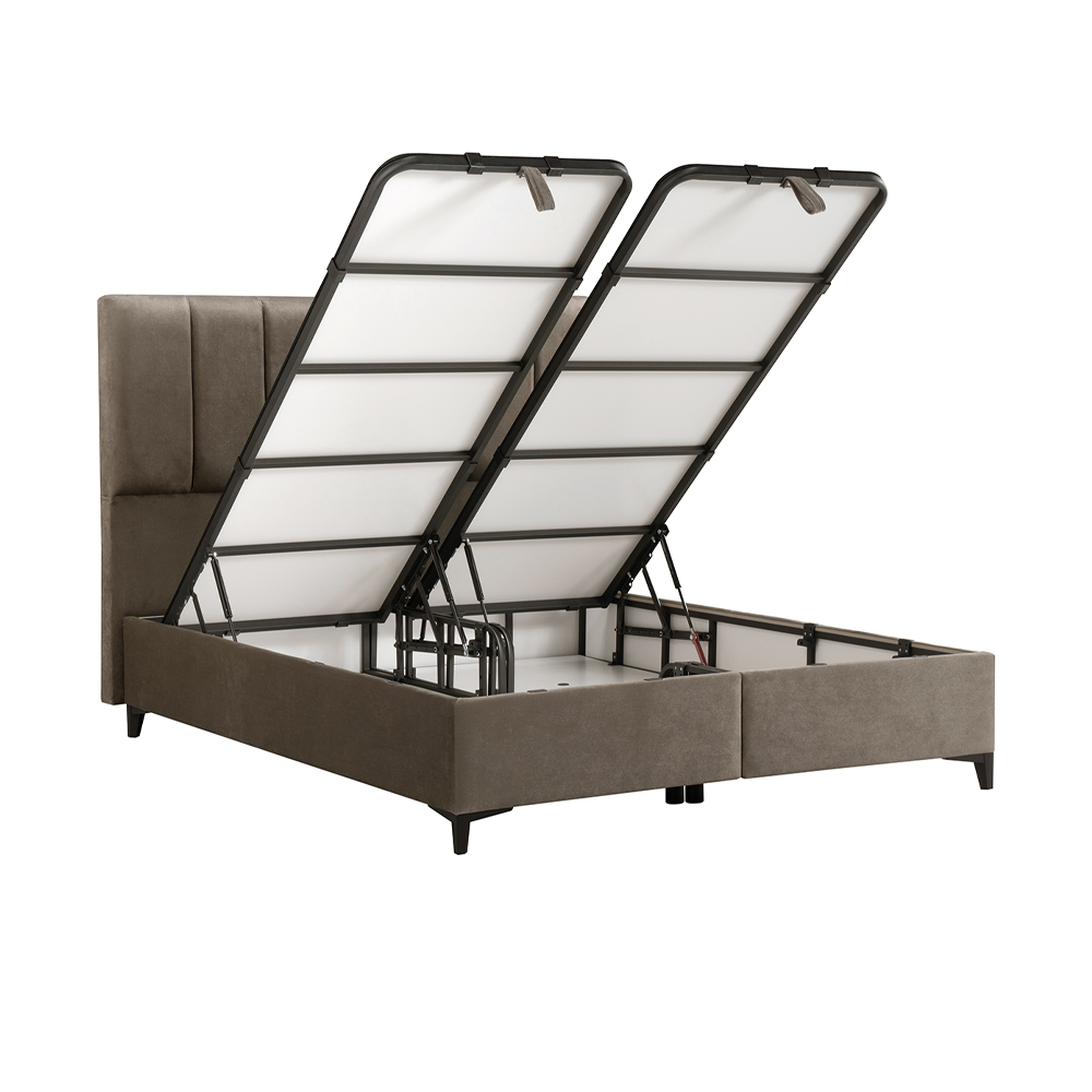 Κρεβάτι με αποθηκευτικό χώρο! Διαθέτει αεριζόμενο, αντιμικροβιακό, ευρύχωρο αποθηκευτικό χώρο και 4 αμορτισέρ ασφαλείας διπλής ενέργειας, που ανασηκώνουν εύκολα το στρώμα. Ειδική σχεδίαση και κατασκευή του κρεβατιού για απόλυτη απουσία τριγμών. Μεταλλικός σκελετός ηλεκτροστατικής βαφής, εξαιρετικής αντοχής, αντικραδασμικός. Πλαϊνά από οικολογική μελαμίνη, επενδυμένα με αφρώδες υλικό & ύφασμα . Απόλυτα επίπεδη και ενιαία επιφάνεια, ιδανική για κάθε τύπο στρώματος .Η επιφάνεια του υποστρώματος είναι καλυμμένη με αντιολισθητικό ύφασμα για την καλύτερη συγκράτηση του στρώματος. Ο πάτος είναι από μελαμίνη πάχους 8mm και φέρει αεραγωγούς. Ψηλά ποδαράκια για εύκολο καθάρισμα.