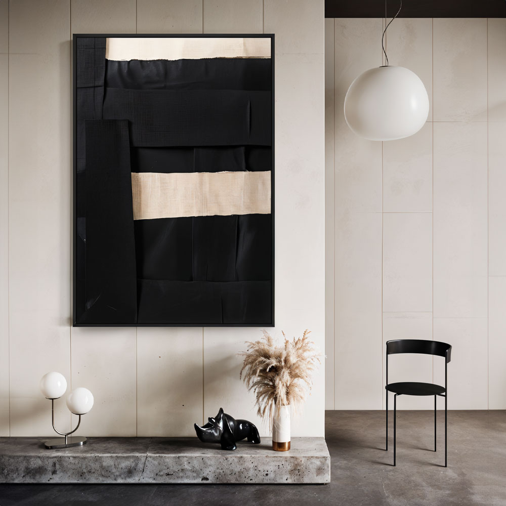 Μοντέρνα ένταση και δυναμική αντίθεση χαρακτηρίζουν το έργο "Acute". Η ανάγλυφη εντυπωσιακή σύνθεση του λινού καμβά και του μαύρου ξύλου δημιουργούν μια αίσθηση πολυτέλειας και δυναμισμού, ενώ ο συνδυασμός της χειροποίητης τεχνικής και της εκτύπωσης αναδεικνύει την υφή και τις λεπτομέρειες του έργου με σύγχρονο τρόπο. Ο πίνακας "Acute" μπορεί να προσδώσει μία αίσθηση δυναμικής πολυτέλειας σε χώρους που απαιτούν μίνιμαλ, αλλά και εντυπωσιακή διακόσμηση.