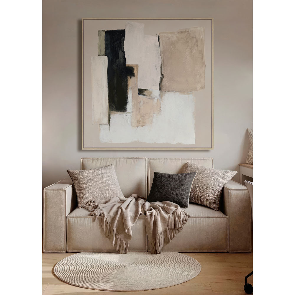 Ο πίνακας SANS FRONT είναι τυπωμένος σε καμβά και τοποθετημένος σε φυσική ξύλινη κορνίζα, που δίνει καθαρότητα και μοντέρνο αποτέλεσμα. Οι μπεζ και μαύρες πινελιές δημιουργούν minimal αισθητική και ηρεμία. Με διαστάσεις 100x100x4 cm, λειτουργεί ως statement piece και γεμίζει άνετα ακόμη και μεγάλους τοίχους. Ιδανικός για σαλόνια, εισόδους σπιτιών, meeting rooms ή σύγχρονους επαγγελματικούς χώρους.