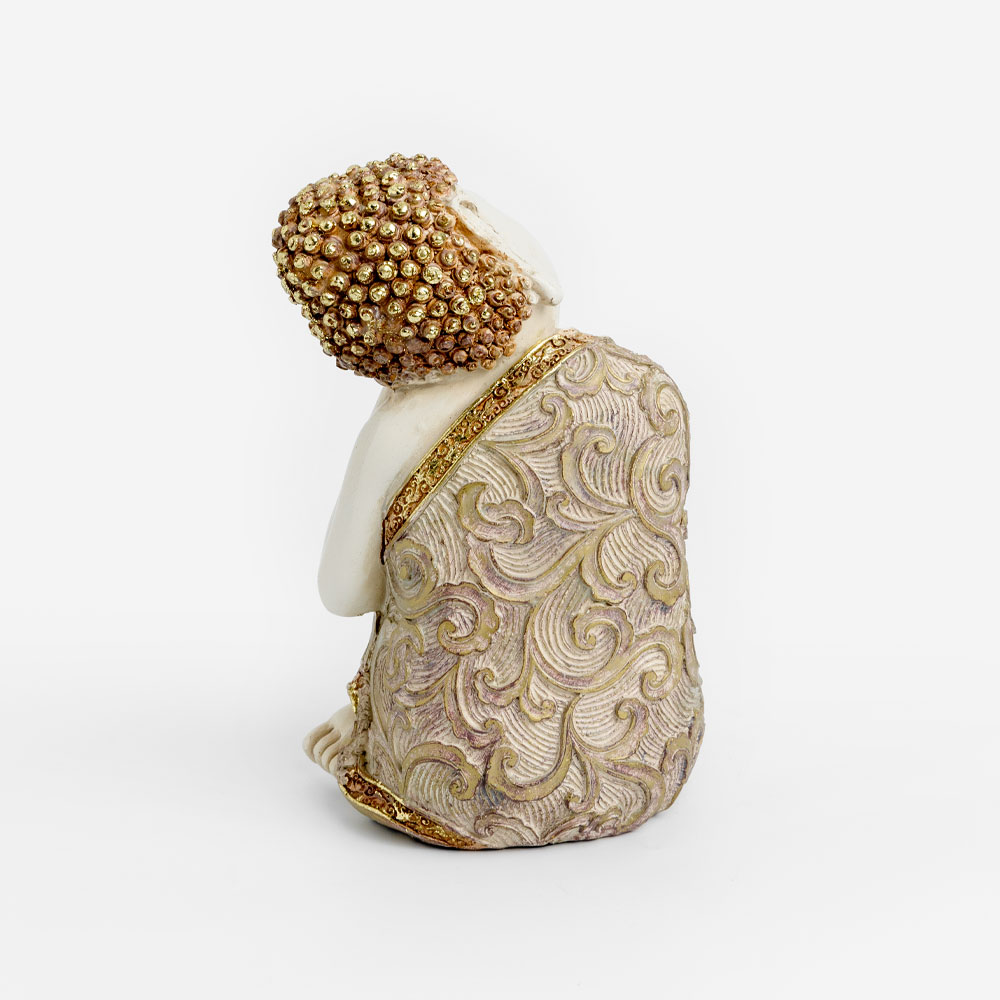 Το FADHI Resting Buddha (10x10x16cm) είναι ένα διακοσμητικό μικρών διαστάσεων που αποπνέει γαλήνη και πνευματικότητα. Με μπεζ χρώμα, χρυσές λεπτομέρειες και διακριτικούς μωβ τόνους, αποτελεί ιδανική προσθήκη για ράφια, κονσόλες ή μικρούς χώρους που αναζητούν μια νότα ηρεμίας.