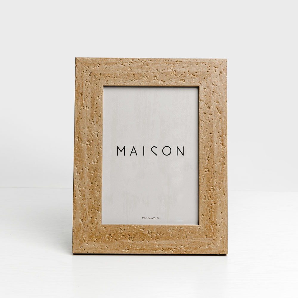 Η κορνίζα LITHOS σε beige με σκούρες λεπτομέρειες δίνει ένταση και χαρακτήρα στη διακόσμηση. Η υφή της παραπέμπει σε φυσικό πέτρωμα, προσφέροντας μοντέρνο αλλά ταυτόχρονα γήινο αποτέλεσμα. Ταιριάζει τέλεια σε χώρους με industrial ή contemporary αισθητική.