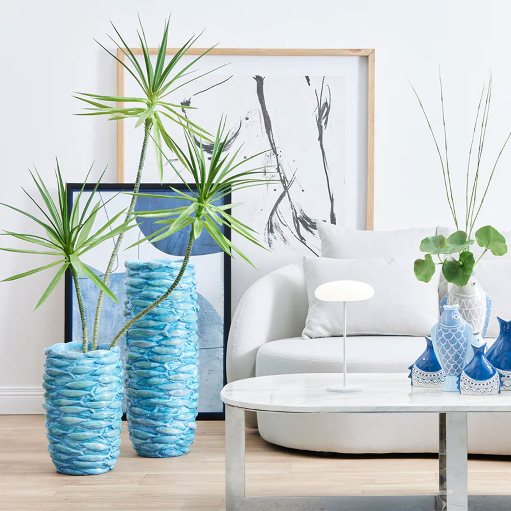 Το OCEAN βάζο ξεχωρίζει με την έντονη μπλε απόχρωση και την κυματιστή ανάγλυφη υφή του. Κατασκευασμένο από polyresin, συνδυάζει χαμηλό βάρος με μοντέρνα εμφάνιση. Ταιριάζει τέλεια με λευκά, ξύλινα ή coastal στοιχεία. Ιδανικό για ξερά κλαδιά, διακοσμητικά stems ή αυτόνομη χρήση ως statement αντικείμενο. Ένα εντυπωσιακό, contemporary decor piece.
