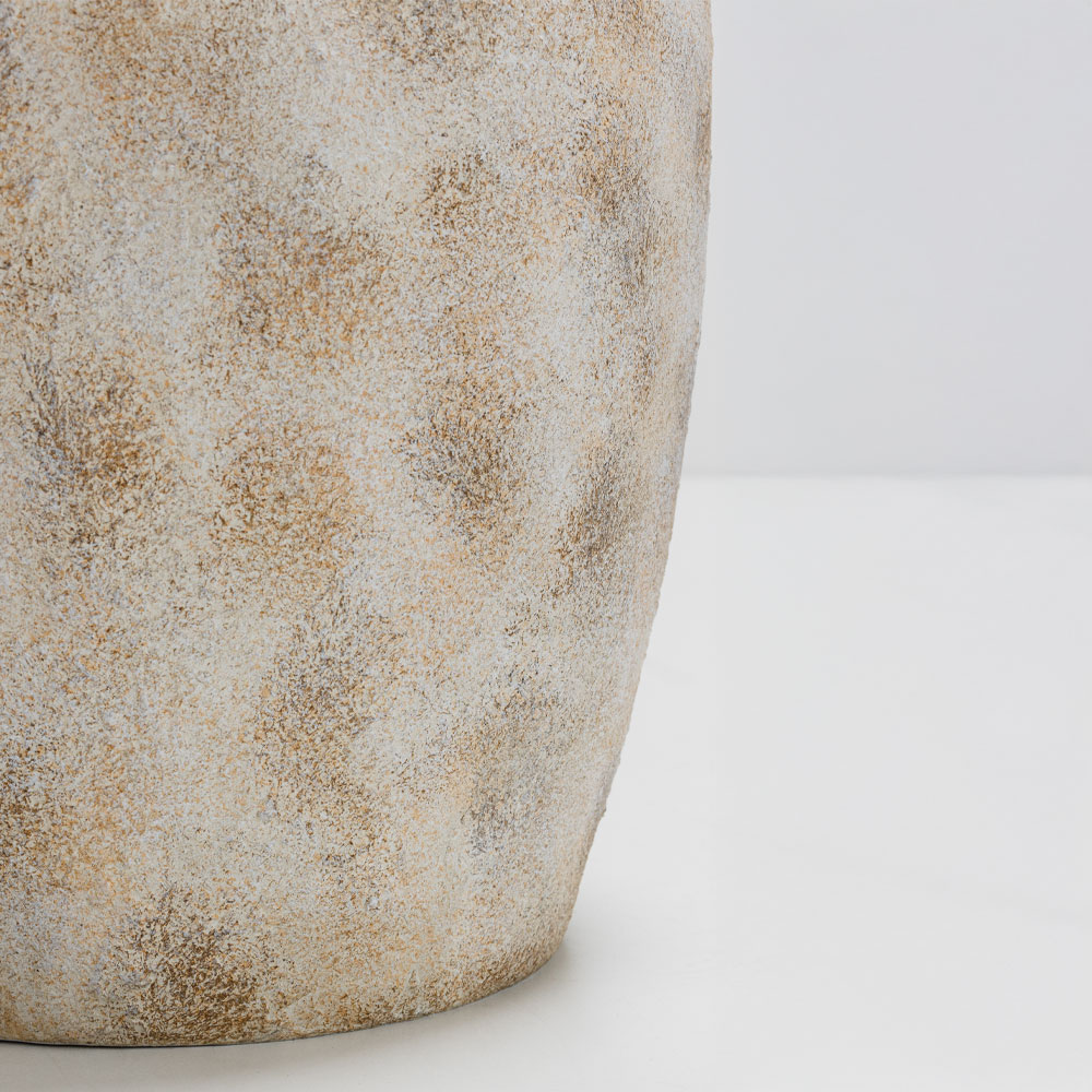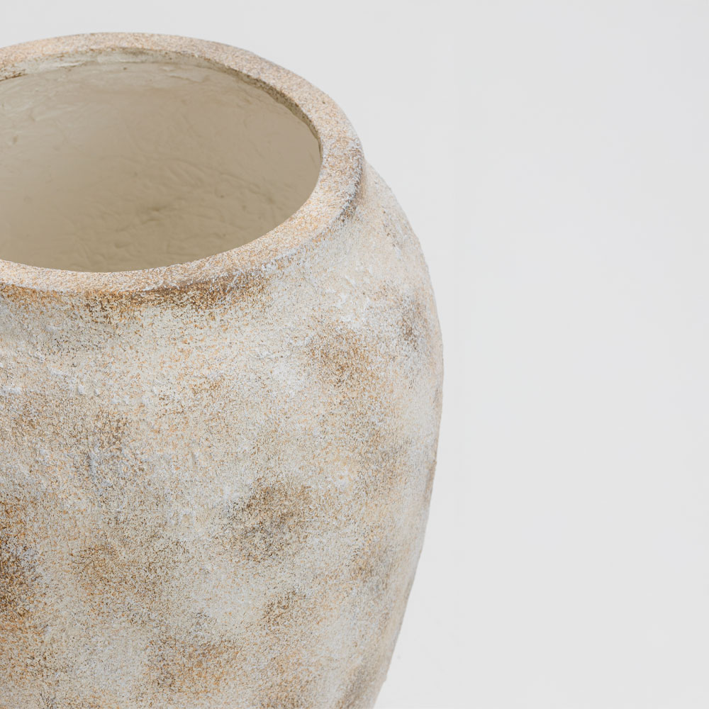 Η γλάστρα SCOPELOS ξεχωρίζει με τη λευκή–μπεζ πατίνα της που θυμίζει παραδοσιακή νησιώτικη κεραμική. Το MgO υλικό της συνδυάζει μεγάλη αντοχή και χαμηλό βάρος, ιδανικό για σύγχρονους ή rustic χώρους. Η απαλή ανάγλυφη επιφάνεια δημιουργεί διακριτική πολυτέλεια και καθαρό, φωτεινό αποτέλεσμα. Ταιριάζει άριστα σε minimal, coastal ή Mediterranean διακόσμηση.