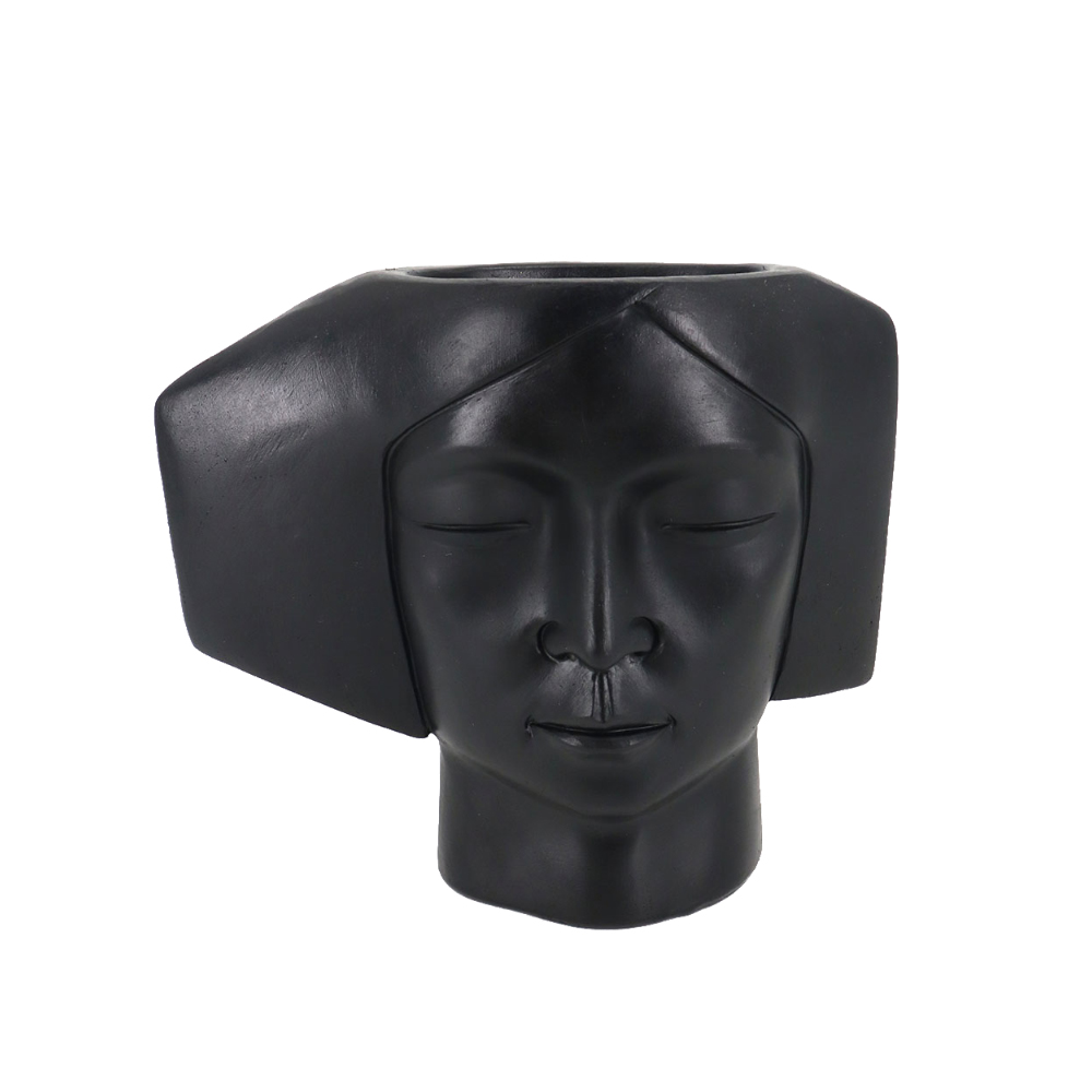 Καλλιτεχνική γλάστρα με γλυπτό πρόσωπο, εμπνευσμένη από μοντέρνες γραμμές και ασιατική αισθητική. Το βαθύ μαύρο χρώμα και η συμμετρική γεωμετρία της δημιουργούν ένα statement διακοσμητικό για κάθε χώρο.