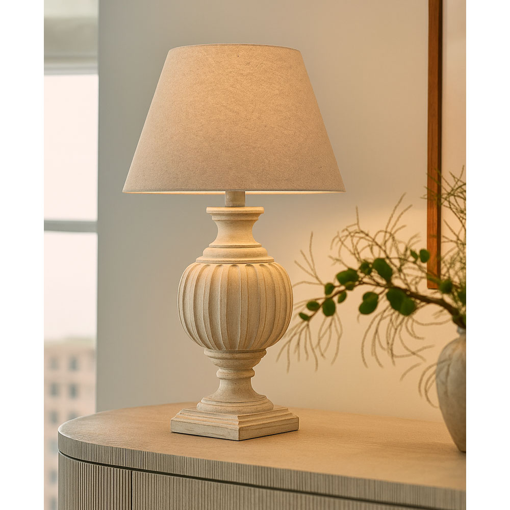 Το επιτραπέζιο φωτιστικό DAMIAN συνδυάζει vintage αισθητική με μοντέρνα απλότητα. Η ξύλινη βάση σε λευκό αντικέ φινίρισμα και το μπεζ υφασμάτινο καπέλο δημιουργούν μια ζεστή, γαλήνια ατμόσφαιρα. Εξαιρετικό για υπνοδωμάτια, καθιστικά ή cozy γωνιές που χρειάζονται απαλό, καλαίσθητο φωτισμό.