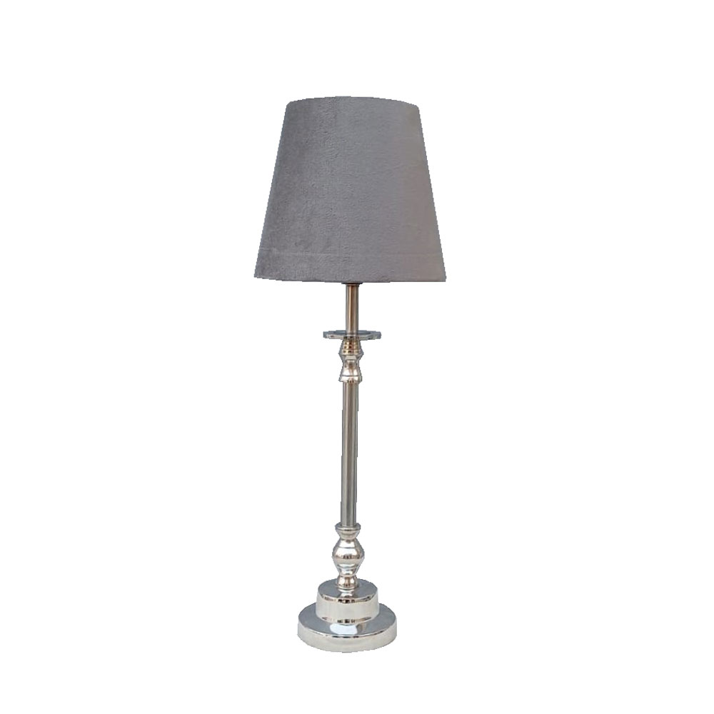 Το επιτραπέζιο φωτιστικό Helge συνδυάζει πολυτελείς υφές με σύγχρονη αισθητική. Η ασημί μεταλλική βάση προσφέρει λάμψη και σταθερότητα, ενώ το γκρι βελούδινο καπέλο προσθέτει βαθύ, ζεστό χαρακτήρα στον φωτισμό. Ένα refined φωτιστικό που ταιριάζει σε σαλόνια, μοντέρνα υπνοδωμάτια και premium επαγγελματικούς χώρους.