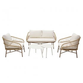 Το σετ σαλονιού Cave είναι ένας συνδυασμός εκλεπτυσμένου σχεδιασμού και απόλυτης άνεσης, ιδανικός για κάθε εξωτερικό ή εσωτερικό χώρο. Η κατασκευή του από σκελετό αλουμινίου με ηλεκτροστατική βαφή προσφέρει εξαιρετική αντοχή στις καιρικές συνθήκες, ενώ το συνθετικό rattan αποπνέει φυσική κομψότητα και διαχρονική αισθητική. Το σετ περιλαμβάνει διθέσιο καναπέ, δύο πολυθρόνες και δύο τραπεζάκια σαλονιού, δημιουργώντας μια ολοκληρωμένη σύνθεση για στιγμές χαλάρωσης. Τα μαλακά μπεζ μαξιλάρια προσφέρουν επιπλέον άνεση, ενώ η minimal και κομψή γραμμή του σετ το καθιστά ιδανική επιλογή για σύγχρονους χώρους με στιλ.
