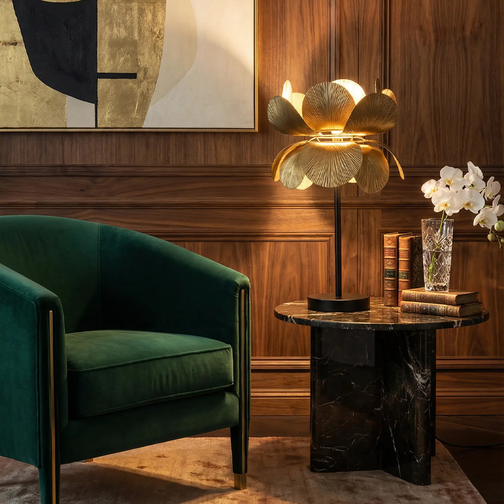 Το επιτραπέζιο φωτιστικό BLOSSOM ξεχωρίζει για τον εντυπωσιακό floral σχεδιασμό του, που θυμίζει μεταλλικό άνθος σε πλήρη άνθιση. Κατασκευασμένο από μέταλλο σε brown gold φινίρισμα, δημιουργεί ένα ζεστό, ατμοσφαιρικό φως και λειτουργεί ως διακοσμητικό statement στον χώρο. Με διαστάσεις 26x26x55 cm, είναι ιδανικό για κονσόλες, side tables ή χώρους φιλοξενίας που αναζητούν έναν συνδυασμό κομψότητας και καλλιτεχνικής έκφρασης.