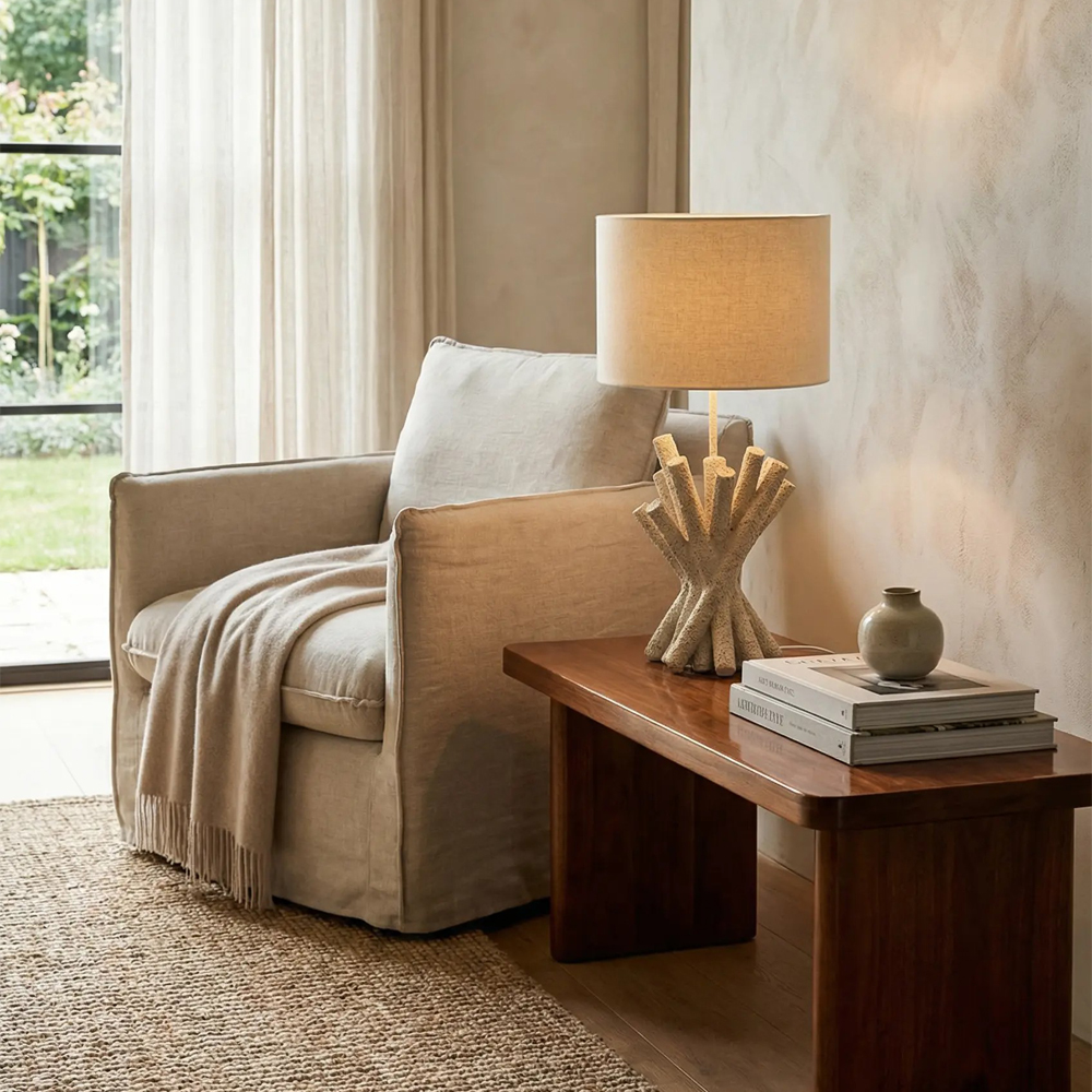 Το επιτραπέζιο φωτιστικό WOODLAND με βάση polyresin σε off-white απόχρωση και λευκό υφασμάτινο καπέλο φέρνει φυσική ηρεμία και soft minimal αισθητική σε κάθε δωμάτιο. Ο organic σχεδιασμός της βάσης θυμίζει κλαδιά δέντρου, δίνοντας χαρακτήρα χωρίς υπερβολές. Ιδανικό για χώρους φιλοξενίας, υπνοδωμάτια και living areas που αναζητούν ζεστή, διακριτική φωτεινότητα. Ταιριάζει σε Japandi, Scandinavian και Organic Modern στυλ διακόσμησης. Ένα φωτιστικό με διαχρονική κομψότητα.