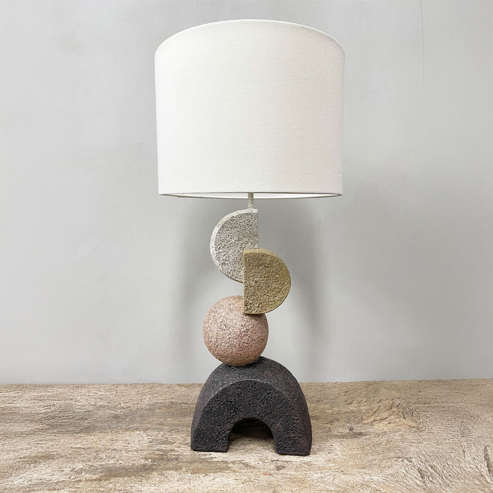 Το επιτραπέζιο φωτιστικό ZENSTONE B εντυπωσιάζει με τη μεγαλύτερη διάστασή του (63 cm) και τον μοναδικό συνδυασμό φυσικών χρωμάτων. Η πολύχρωμη βάση προσφέρει καλλιτεχνική διάθεση, ενώ το λευκό καπέλο διαχέει ήπιο, ισορροπημένο φως. Ιδανικό για statement γωνιές, σαλόνια ή χώρους φιλοξενίας που χρειάζονται ζεστό χαρακτήρα.