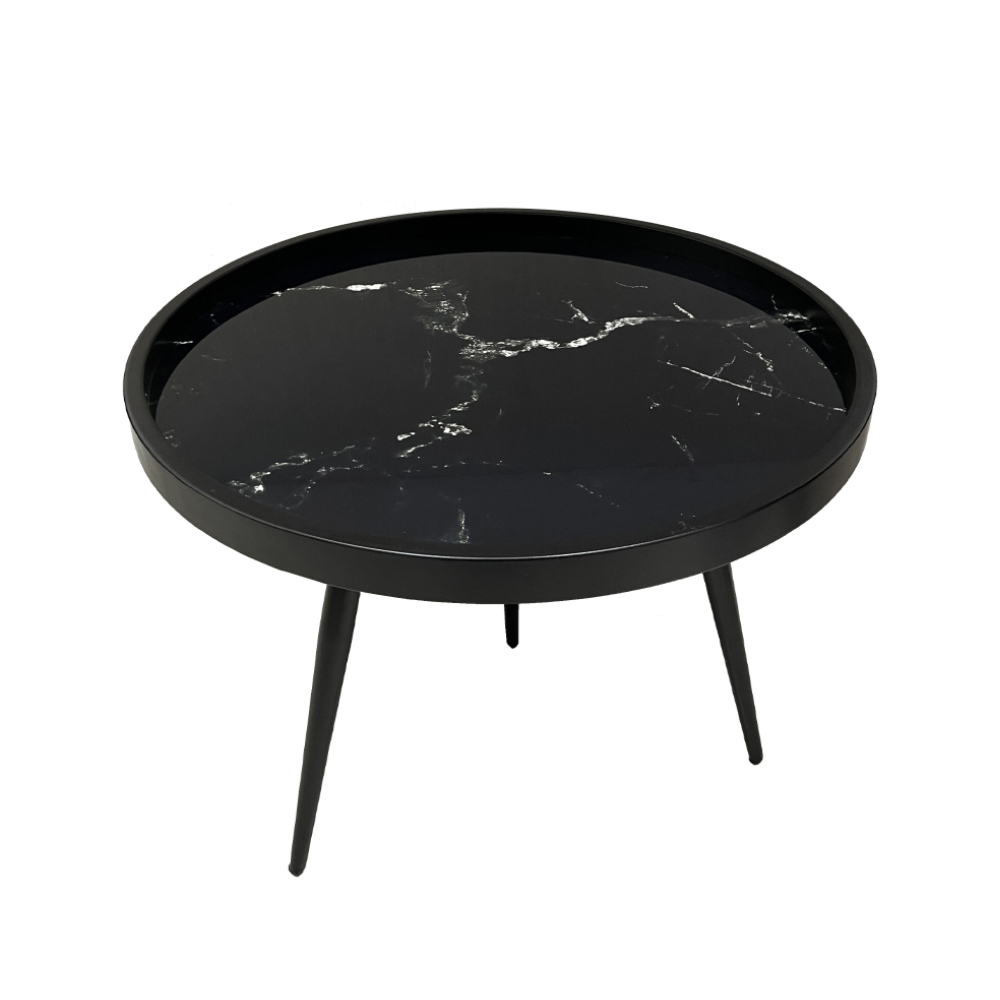 Το στρογγυλό τραπεζάκι σαλονιού Marm σε μαύρο χρώμα με εφέ μαρμάρου και μεταλλικά πόδια αποτελεί μια κομψή και μοντέρνα προσθήκη για κάθε χώρο. Η επιφάνειά του είναι κατασκευασμένη από μαύρο mdf με εφέ μαύρου μαρμάρου, προσδίδοντας μια αίσθηση πολυτέλειας και κομψότητας. Τα τρία μεταλλικά πόδια του τραπεζιού προσφέρουν σταθερότητα και αντοχή, ενώ το μαύρο τους χρώμα ταιριάζει απόλυτα με την επιφάνεια, δημιουργώντας μια ομοιόμορφη και εντυπωσιακή εμφάνιση. Το τραπεζάκι σαλονιού Marm μπορεί να χρησιμοποιηθεί μόνο του ώς κεντρικό τραπεζάκι στο σαλόνι μπροστά απο τον καναπέ, ή σε συνδυασμό με το βοηθητικό τραπεζάκι Marm, δημιουργώντας δύο επίπεδα, για μεγαλύτερη πρακτικότητα και στύλ.